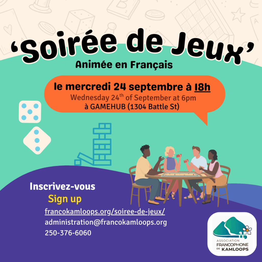 Venez jouer à des jeux avec nous à Gamehub (1304 Battle St) le mercredi 24 septembre! Pour tous les âges et tous les niveaux de français.
